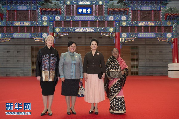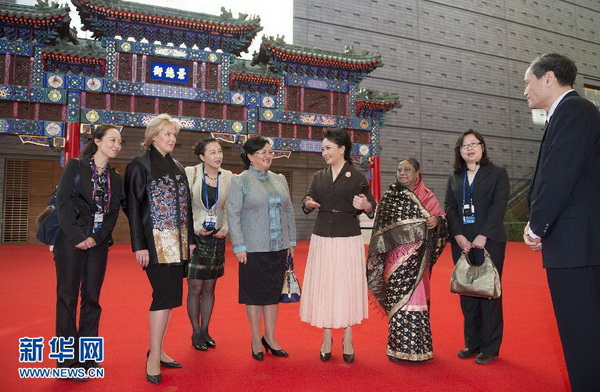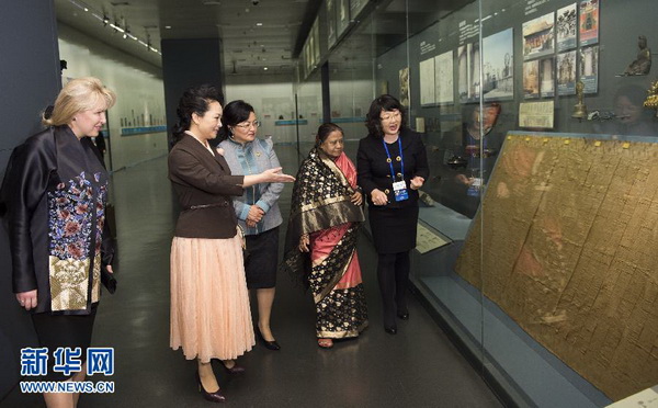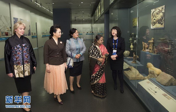 上午,孟加拉国总统夫人卡娜姆、蒙古国总统夫人包勒尔玛、上海合作组织秘书长夫人弗罗洛娃抵达首都博物馆时,彭丽媛热情迎接。