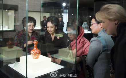 彭丽媛对首都博物馆的展览饶有兴致,对藏品连连称赞,十分关切。夫人团在首都博物馆近1小时的展览参观过程中,彭丽媛表示她非常喜欢博物馆,多次提到会再来首都博物馆参观。