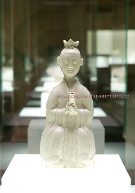 武俊玲给夫人们讲解的第一件展品是宋代的定窑白釉童子诵经壶。“这是1000年前当时中国的定窑烧制的白釉童子诵经壶。定窑主要烧造白瓷,这样精美的定窑瓷塑全国仅此一件。”武俊玲说,这把壶整体设计为一个少年端坐读经书的样式:少年头顶束冠,冠中开孔成为壶的注水口,双手捧着翻阅的经卷为出水口,壶柄在身后。通体施白釉,釉面匀净。这把壶巧妙地将实用和艺术设计完美的结合起来,是定窑杰出的作品。“听完讲解后,彭老师还给夫人们做了进一步的解释:这样精美的定窑瓷塑,全国仅此一件。”
