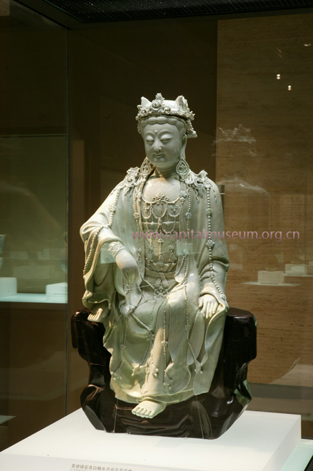 元代的景德镇窑青白釉水月观音菩萨像是夫人们最感兴趣的展品之一。武俊玲介绍说,公元13世纪的元大都,是当时世界最著名的大都市,城址就在今天的北京市内。首都博物馆是元大都遗址出土文物的主要收藏单位。这个展厅每一件元代文物都在中国瓷器史上占有重要的地位。“这尊水月观音菩萨像制作非常精美,全国仅此一件,1955年出土于北京元大都城址范围内。”这尊水月观音菩萨像最为引人注目的是观音慈祥悲悯的眼神,因为观音像在中国古代是被供奉在殿堂中较高的位置上,人们都要仰视她。当我们仰视她时,无论我们在那个角度,她好像都注视着我们,恰似俯视芸芸众生,传递出无穷的艺术魅力。“我们可以稍稍蹲下一点,感受一下观音的目光。”夫人们都俯下身来,从每个角度关注观音的眼神,“非常美。”