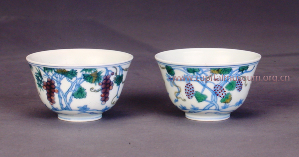 明代成化景德镇窑斗彩葡萄纹杯是一对玲珑精巧的小杯子,成了夫人们的重点关注展品。武俊玲说,这对葡萄杯烧造于15世纪中国明代的成化年间,出土于北京一个贵族墓葬中。杯外壁主绘葡萄、赖瓜、桑葚等图案,寓意多子多福。杯壁上的折枝葡萄纹以透明绿彩为叶,黄彩为蔓、紫彩为果实,色泽浓淡相宜。其中姹紫色在后代从没有仿制出来过,成为空前绝后的制作工艺。这对小杯子采用的是釉下青花和釉上彩结合的斗彩工艺,也就是二次入炉烧成的瓷器。
