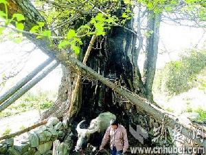 该村86岁村民冉世英说,这棵银杏树在1976年7月被雷电击中燃烧,大火烧毁了大树主干,整棵树看上去只剩了一张树皮,奄奄一息,此后逐步枯萎。对于这株被“烧死”的古银杏树,沙河乡政府及当地村民仍然抱有一丝希望,对其做了相应保护措施。多年的期盼今年变为现实,虽然烧空的树洞可以容下两条水牛(如图),但古树看上去郁郁葱葱,活力再现。