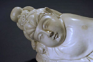 这件宋定窑“美人枕”,长43厘米,宽15.5厘米,质地细腻,釉色白润如玉,工艺精巧。此枕塑造了一个丰满美人的“迷人睡姿”——其双手枕于头下,两脚叠压稍稍抬起,衣纹线条流畅,尽显雍容华贵,透露出唐人遗风。