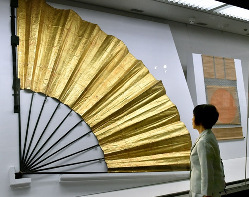 据日媒报道,纪念日本江户幕府的开创者、一代名将德川家康逝世400周年的“大关原展”,近日在京都文化博物馆开幕。德川家康曾使用过的长约2.2米的巨大金扇马标也在此次展出。
