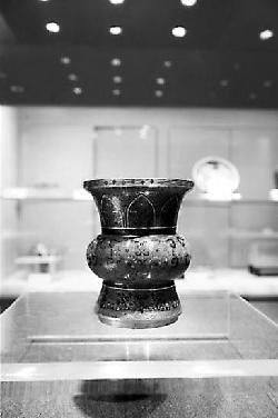 乾隆铜胎掐丝珐琅兽面纹尊被单独展出。工作人员介绍,这件文物属于仿古铜器,应该是乾隆皇帝仿上周时候的青铜器做的一件古玩。这件兽面纹尊外壁施浅蓝色珐琅釉、金丝工整、排列有序,口部也用浅蓝色珐琅,上面还有缠枝莲纹,中部和底部的兽面庄重又不失可爱。