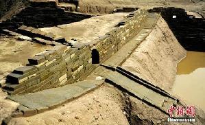 图为考古现场发掘出唐代砖砌沟渠全长共90米,形状蜿蜒曲折,最宽处有近6米,最窄处不足1米,深达1.6米。