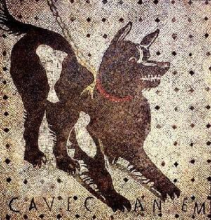 这是一幅用马赛克拼成的图案,上面有一只造型生动的狗,位于意大利南部那不勒斯附近著名庞贝古城的一所房子里。