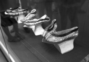 那么,古代女子的鞋有啥讲究?展柜里,展出了一排清代女子的鞋,有“高跟鞋”、尖头鞋、平底鞋……细细看去,这些鞋子都比现代的鞋子小,都是要裹脚穿的。“高跟鞋”其实是马蹄底鞋,就是从鞋子中间一直到脚后跟,高出一大截,没有一定的“功夫”走路很容易摔跤。尖头鞋,只有巴掌大小,鞋头很尖,也是通常大家所说的“三寸金莲”。“我们国家裹脚最早出现在宋代,那时候,裹脚不需要把脚指头凹进去,就是把脚裹起来,塑型。”这次展览的策展人曹清介绍,在宋代裹脚是一种时尚,女孩都以裹脚为美。