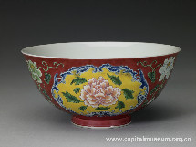 胭脂红地珐琅彩开光折枝牡丹纹碗