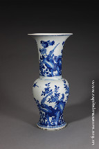 凤尾尊又称“花觚”。此尊造型大方,纹饰工细精丽,尤以青花呈色最佳,堪称康熙青花上乘之色——“翠毛蓝” 。康熙青花瓷以其清新悦目、层次分明的特色而居清代之冠。宋徽宗曾绘锦鸡芙蓉,称锦鸡有“五德”之全。