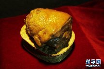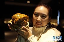 10月11日,工作人员在展示“东坡肘子”肉石。近日,河北省张家口市经开区察哈尔文化城一专门收藏展示肉石的展馆开馆,在我国观赏石界、收藏界引起轰动的“东坡肘子”肉石“落户”该馆,引起业内外关注。该石由河北收藏家于瑞军收藏,系纯天然玛瑙质原石,长14厘米,宽12.5厘米,高9厘米,重约1950克,造型生动逼真,石质细腻,其皮、膘、肉、骨、毛(孔)等品相俱佳。