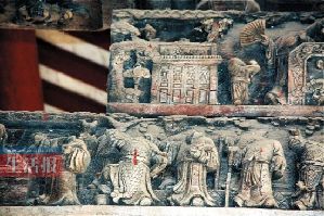 10月16日,记者在那连古圩采访时,看到北帝庙的主体建筑依然完好,屋檐、梁架上的雕刻和壁画精美,却有明显的破坏痕迹。如壁画被涂抹严重,有的地方甚至被铲掉,而梁架上的浮雕人物则大多没有脑袋,只剩下身体躯干。
