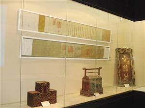 本次展出除了我国古代的圣旨外,还有越南、朝鲜、日本等国家的圣旨,另外还有放置圣旨的器具、古代官员和夫人的行头等。