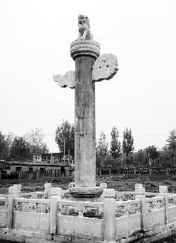 伊桑阿墓是保存相对完好、规模较大的清代大臣墓,同时也是市级保护文物。但2013年初这里的一座华表遭“破坏性偷盗”,断成三截。近日古墓启动大修,断裂的华表柱被重新竖立,被盗毁的蹲兽、莲盘、云板都一一由仿品替代。