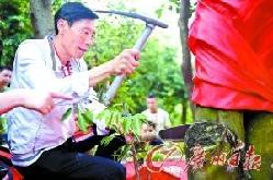 莞香,作为东莞传统文化的瑰宝,每年冬季,是莞香成熟收获时节,农历小雪是东莞香林香农传统采香的日子。昨日正值农历小雪节气,上午10时,在大岭山镇莞香非物质文化遗产保护园内,在国家级非物质文化遗产项目“莞香制作技艺”传承人黄欧的带领下,参加活动的人员观看了古法采香的全过程。