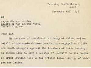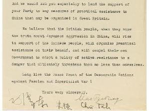 “我们想要代表中国向贵党寻求任何有可能来自英国的实际帮助,”信中写道,“我们相信,当英国人民了解日本在中国所犯下的恶行之后,就会选择和我们站在一起,选择以你们的名义帮助中国人民,并选择督促你们的政府来防范这个很有可能给英国带来同等、甚至更残酷威胁的敌人。”