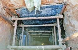 盗洞深达10米,为防止塌陷用钢管木板加固四壁。