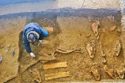 考古专家介绍,考古发现得分成两个阶段说,一个阶段是2013年9月至2014年6月,其中一车马坑发现了6辆车13匹马,目前考古工作进行完毕,已保护性回填;另一个阶段是今年6月至今,2座墓葬、1座车马坑正在发掘中。