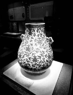 展出的青花缠枝番莲纹双耳尊。