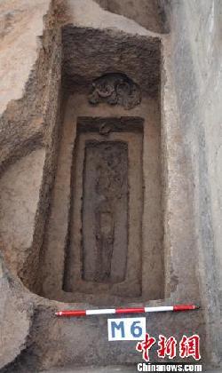 此外,发现墓葬中的一座为西周中期竖穴土圹墓,葬具一棺,仰身直肢葬。人骨保存较完整,头骨有朱砂痕迹,口中含海贝五枚。
