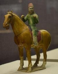根据陈列展览规划,首次展览的主角是唐三彩,主要包括三彩骑马俑24件、三彩立俑86件、三彩水井和三彩磨各1件。其中三彩骑马俑以头饰的差异可分为小冠俑、风帽俑和幞头俑三型,人物端坐于马上做演奏状,有的吹箫,有的持鼓,为乐伎的形态。