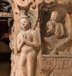 元旦期间,云冈石窟研究院举办了“职工书画摄影雕塑作品展”。这次展览中,一幅特别的摄影作品引起了广泛关注:这是一张由研究院员工摄于云冈第8窟后室南壁明窗西侧壁的供养菩萨像,菩萨头戴日月宝冠,双手合掌,温婉的笑容堆满丰润的面庞,除了罕见地露出6颗牙齿外,脸颊上竟还有一对深深的酒窝。