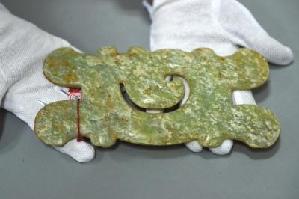 工作人员向记者展示追回的文物“勾云形玉佩”
