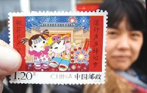 1月10日,中国邮政发行《拜年》特种邮票1套1枚,邮票面值为1.2元。这是中国邮政再次发行以“拜年”为主题的邮票。《拜年》邮票画面以“欢欢、喜喜”两个卡通形象为主要元素,“欢欢”戴着“猴帽”左手高举竹竿,竹竿上挂着火红的正在燃放的鞭炮,炮花如绽放的春之花,绚丽多彩;“喜喜”双手捂耳,一脸喜悦,笑逐颜开。两侧吉祥如意的对联:“爆竹声声辞旧岁,桃符户户贺新春”,由我国著名书法家欧阳中石所题。