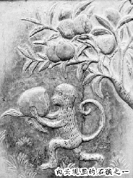 第三只石猴最难找,它隐藏在白云观东侧院雷祖殿的石碑底座上。该猴一手搭在额头,另一手高举着一只寿桃。不用说,这只石猴代表了“寿星”。“寿星”又称“南极仙翁”,是长寿之神。