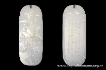 该玉牌规矩厚重,高宽厚各部比例协调匀称,玉质细腻油润。作品正面精心浮雕山水画面,构图严谨,布局合理,远中近景层次分明,山清水秀,景致优雅。背面镌刻诗仙李白名作《渡荆门送别》的名家手迹,意境高远,想象瑰丽,与正面山水画面前呼后应。整体作品情景交融,集诗书画印于一体,讴歌美好生活,赞美锦绣河山。