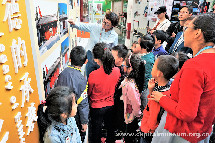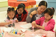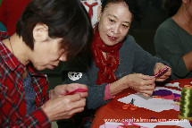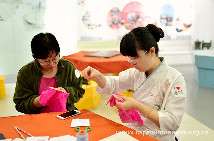 家长和孩子们在《读城——发现北京四合院之美》展厅,了解四合院建筑型制的内涵和外延,体会老北京的风俗文化,动手彩绘四合院花卉陶盘、刮画老北京传统门楼、软陶制作创意门墩、制作鸡毛毽等等,传承与创新传统民俗文化。在中秋节当天所举办的彩绘兔儿爷和彩绘兔子年画的活动更使得观众在博物馆中感受到浓浓的节日氛围。两场专为成人准备的燕京八绝之京绣和传统荷包也让观众在一针一线间感受传统手工技艺的魅力,将暖暖的温情传递。