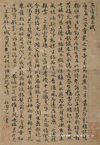 首都博物馆藏《吴宫万玉赋》是赵孟頫行书风格的代表作,正篇尺幅不大,但书写得秀丽流畅,气韵贯通,神采具佳,运笔颇近其所主张的“贵有古意”之魏晋风貌。其实《吴宫万玉赋》这类风格的书法在当时颇具新意,风格圆润俊美,可谓柔中带刚、骨力内敛而不张扬,一改南宋以来书法风格锋芒毕露、纵情恣意的衰弊局面,从而显示出一代书法宗师的新风尚。