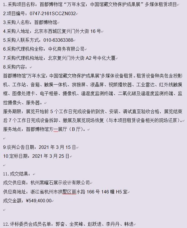 “万年永宝:中国馆藏文物保护成果展”多媒体租赁项目成交结果公告