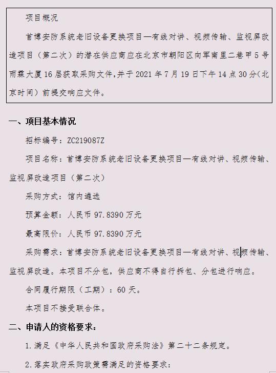 首博安防系统老旧设备更换项目—有线对讲、视频传输、监视屏改造项目(第二次)