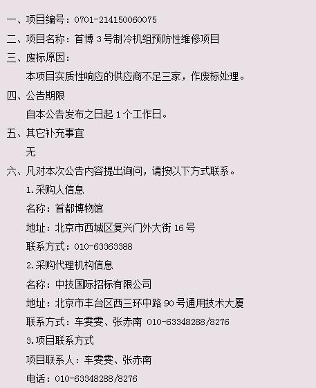 首博3号制冷机组预防性维修项目废标公告