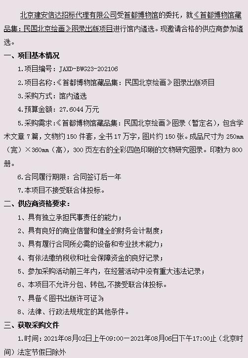 《首都博物馆藏品集:民国北京绘画》图录出版项目馆内遴选公告