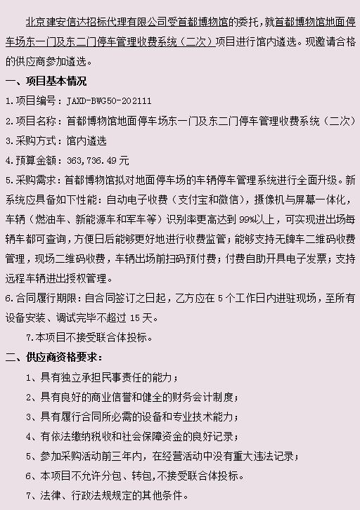 首都博物馆地面停车场东一门及东二门停车管理收费系统(二次)馆内遴选公告