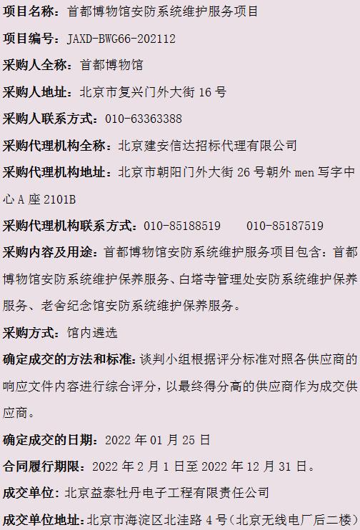 首都博物馆安防系统维护服务项目馆内遴选采购成交公告