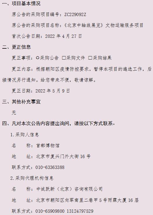 《北京中轴线展览》文物运输服务项目采购暂停公告