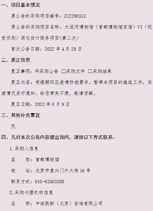 大运河博物馆(首都博物馆东馆)VI(视觉识别)深化设计服务项目(第二次)采购暂停公告