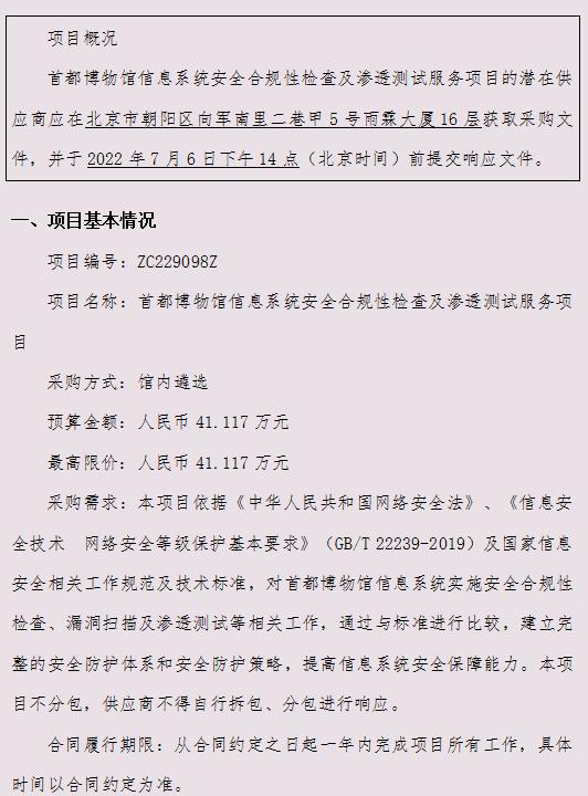 首都博物馆信息系统安全合规性检查及渗透测试服务项目