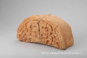 这件饕餮纹半瓦当硕大厚重,直径约为一般瓦当的两倍,应为战国燕都宫殿建筑使用的瓦当,可以推断其所在宫殿建筑规模之大。瓦当中部为正面饕餮,图案对称。双目为长方形圆角,或左上角与右下角起尖,眼角后扬,有眼眶。鼻宽、口阔。眼上分别两条蟠龙,C形卷曲,蟠龙口张向尾。蟠龙似作饕餮双眉。饕餮纹大口张开,威严震慑。战国时期燕国瓦当上的饕餮纹与商代饕餮纹最为接近,燕下都遗址发现饕餮纹半瓦当数量较多。