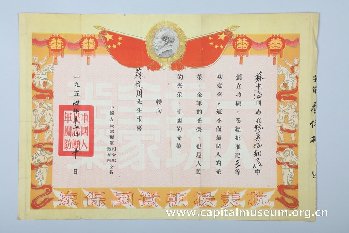 此件藏品是2014年苏东海、王迪夫妇捐赠给首都博物馆藏品中的一件。它是1954年由中国人民志愿军司令部政治部颁发给苏东海先生,对他在抗美援朝工作中的表现给予肯定和表扬,并批准记三等功壹次,且向苏东海先生的父亲苏从周先生报喜。