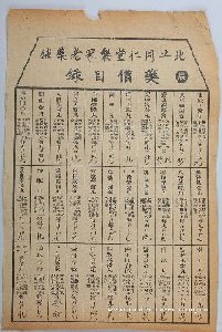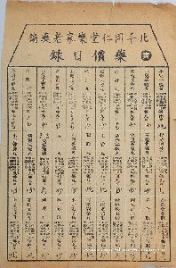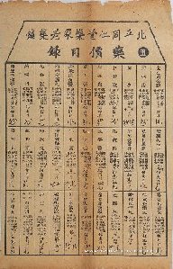 同仁堂是目前国内最负盛名的中药老字号,始建于清康熙八年(1669年),位于前门外大栅栏,创始人乐显扬,号尊育。其子乐凤鸣将研究的配方分门别类汇集成书。药铺以“修合无人见,存心有天知”为服务宗旨。特别是成为清宫廷御药房“供奉”后,名声显赫。乐凤鸣还印制了《同仁堂药目》一书发行全国。《北平同仁堂乐家老药铺药价目录》一套按照十二时辰分类:子、丑……亥,这件为一套中的4件,分别为子、丑、寅、辰,每张上面3列11行,共33格,每格内标注药品名称、治疗病症及每丸或每瓶等当下价格,可见同仁堂售卖药品齐全且童叟无欺。所以旧京竹枝词咏同仁堂云:“都门要铺数同仁,丸散人人道逼真,纵有歧黄难别味,笑他若个术神通。”