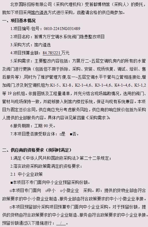 首博方厅空调水系统阀门隐患整改项目馆内遴选公告
