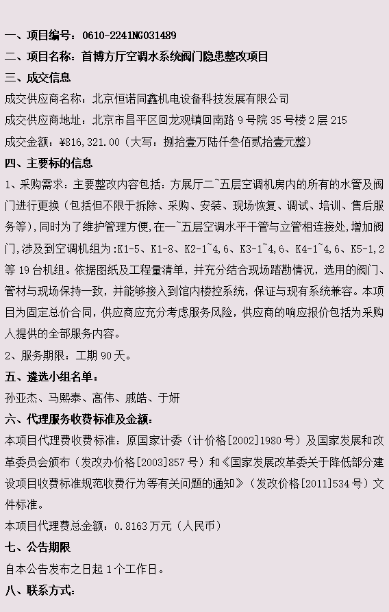 首博方厅空调水系统阀门隐患整改项目成交公告