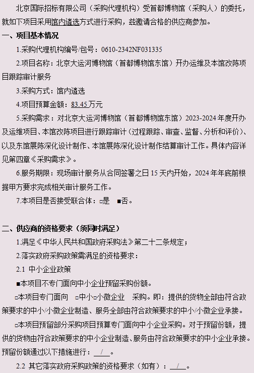 北京大运河博物馆(首都博物馆东馆)开办运维及本馆改陈项目跟踪审计服务遴选公告