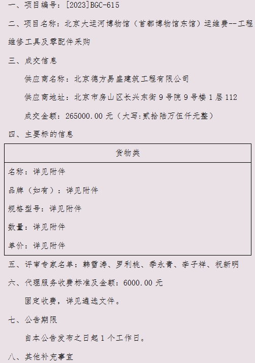 北京大运河博物馆(首都博物馆东馆)运维费--工程维修工具及零配件釆购成交结果公告