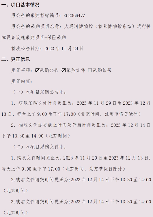 大运河博物馆(首都博物馆东馆)运行保障设备设施采购项目-保险采购更正公告