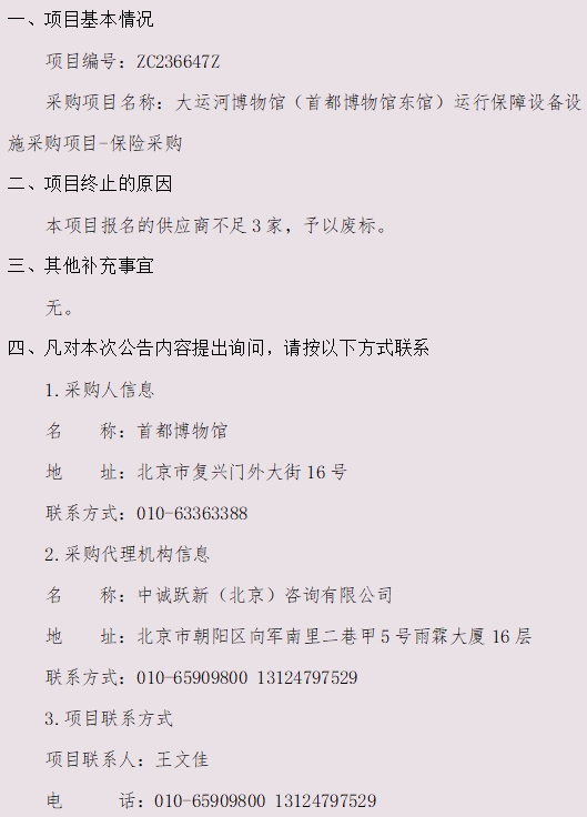 大运河博物馆(首都博物馆东馆)运行保障设备设施采购项目-保险采购废标公告